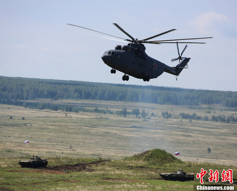 8月12日,“和平使命-2013”聯合反恐軍演中俄兩軍參演部隊在切巴爾庫爾合同訓練場舉行全員全要素實兵協同訓練。雙方共出動官兵近900人,坦克、步戰車、直升機等武器裝備約130臺,雙方導演部總導演——俄中部軍區司令員波格諾夫斯基和沈陽軍區副司令員石香元,共同到演習地觀摩并指導兩軍訓練。中新社發 李祥輝 攝