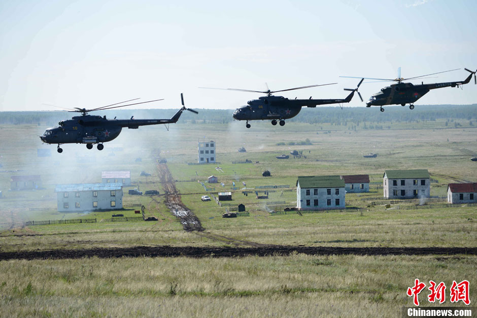 8月12日12時(北京時間下午2時),“和平使命-2013”中俄聯合反恐軍事演習,在俄羅斯切巴爾庫爾合同訓練場進行了實兵實彈協同訓練。圖為中方武裝直升機發射干擾彈隱蔽接敵。中新社發 譚長俊 攝