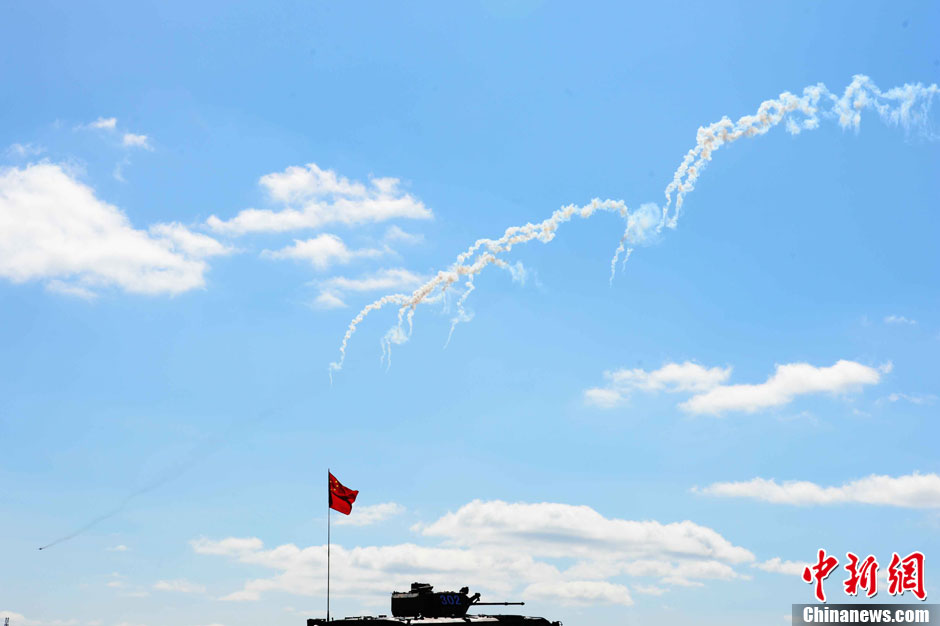 8月12日12時(北京時間下午2時),“和平使命-2013”中俄聯合反恐軍事演習,在俄羅斯切巴爾庫爾合同訓練場進行了實兵實彈協同訓練。圖為陸空協同對敵實施打擊。中新社發 譚長俊 攝