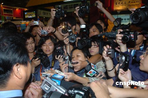 十月十八日,眾多媒體記者在威尼斯人會展中心舉行的第十二屆澳門國際貿易投資展覽會(MIF)上,爭搶采訪某省的負責人。規模宏大,盛況空前的第十二屆澳門國際貿易投資展覽會(MIF),以努力打造成國際貿易平臺為己任,引起了新聞媒體的極大關注。中新社發 史利 攝
