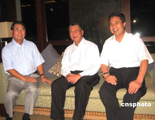 十月二十九日,澳門特別行政區(qū)行政長(zhǎng)官何厚鏵率澳門政府代表團(tuán)和澳門房地產(chǎn)企業(yè)家代表團(tuán)一行一百五十四人訪問(wèn)海南三亞。中共海南省委書記衛(wèi)留成(左)、海南省長(zhǎng)羅保銘(右)當(dāng)天在三亞希爾頓大酒店會(huì)見并宴請(qǐng)了何厚鏵一行。中新社發(fā) 尹海明 攝