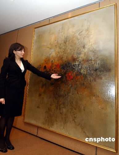 圖為趙無極作品《大地無形》,運用了原始的五種顏色分別隱喻樹木,太陽,大地,及晝夜,巧妙地把文字、形像與構圖完全融合一體,估價2,000萬港元,預料將打破趙無極作品世界拍賣紀錄。