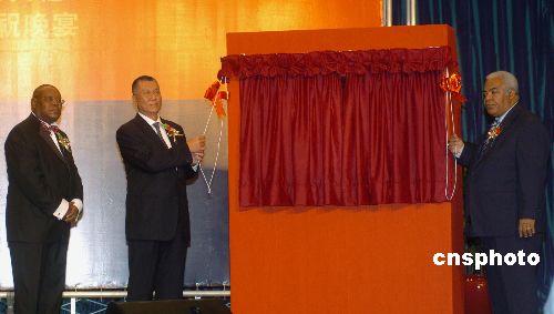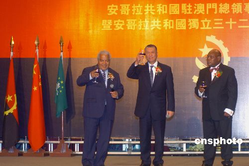 十一月九日晚,安哥拉共和國駐澳門總領事館開幕典禮暨安哥拉獨立三十二周年慶祝酒會在澳門漁人碼頭舉行,澳門特首何厚鏵與安哥拉共和國外交部秘書長Manuel Gomes dos Santos為安哥拉共和國駐澳門總領事館揭幕。 中新社發 史利 攝