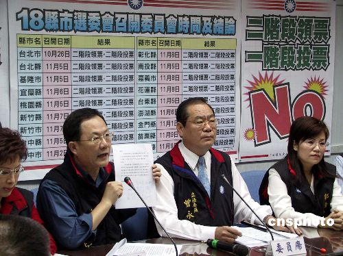 中國國民黨“立法院”黨團十一月十四日表示,支持十八個縣市選舉委員會的決定,希望明年“立委”選舉與“公投”同日舉行時,采“二階段領票,二階段投票”方式,讓選舉順暢單純。圖為國民黨“立委”丁守中出示全臺灣二十五個縣市議會議長的共同聲明,他們表示支持這一投票方式。中新社發 劉舒凌 攝