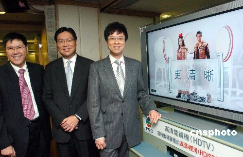 11月26日,香港就推出“數碼地面電視廣播”舉行記者會,商務及經濟發展局局長馬時亨,與電視廣播有限公司的高層陳志云(右)和鄭善強(左)在記者會現場,參觀香港電視廣播有限公司(TVB)的高清數碼電視廣播的片段。中新社發 鄧慶樂 攝