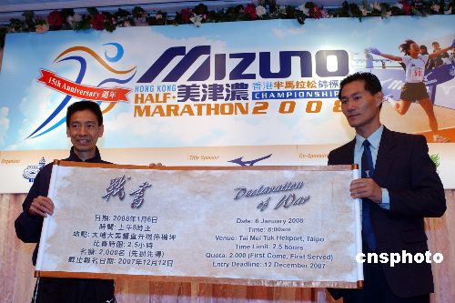 11月30日,香港資深長跑好手李嘉綸(左)代表參賽跑手,從香港田徑總會長跑部主委王劍麟手中接過參賽戰書。香港業余田徑總會當日宣布,一年一度的香港半馬拉松錦標賽將于2008年1月6日舉行。中新社發 蔡蔓莉 攝