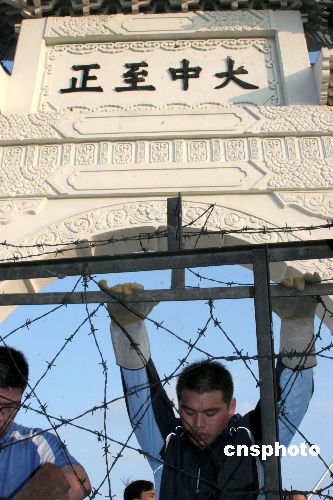 十二月六日,臺北“中正紀念館”在爭議聲中開始封館,“大中至正”牌樓將要拆除。圖為當天下午,臺灣當局調派的警察在門前設置拒馬。中新社發 董會峰 攝