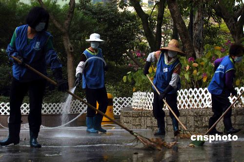 12月7日早上,香港康文署人員在屯門公園以清水開釋消毒藥水清洗場地。半個月內,屯門公園在同一地點發(fā)現(xiàn)有雀鳥確診或懷疑帶有禽流感病毒。中新社發(fā) 譚達明 攝