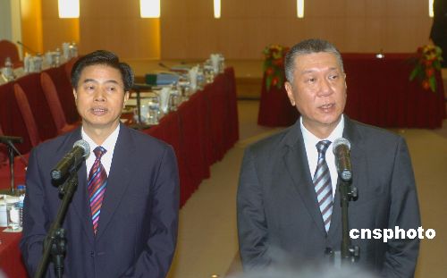 圖為澳門特首何厚鏵(右)與廣東省省長黃華華(左)在澳門政府總部會見記者