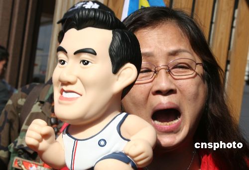 十二月二十八日,前臺北市長馬英九特別費案二審宣判無罪。圖為一位支持者手持馬英九玩偶,高呼“馬英九無罪”等口號。中新社發 董會峰 攝