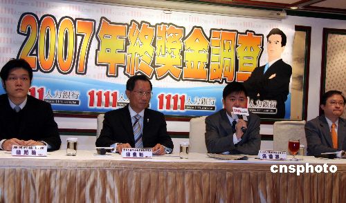 一月二十八日,臺灣1111人力銀行在臺北發布其最新完成的二○○七年終獎金大調查,結果顯示:與上一年度僅一成三受訪者沒有年終可領相比,二○○七年有超過三成上班族確定領不到任何年終,增長一百五十三個百分點。一成五企業不發放二○○七年終獎,不賺錢、景氣差是主要原因。中新社發 孫自法 攝