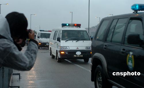 押解歐文龍的囚車(白色)在警車的護衛下駛入澳門終審法院。