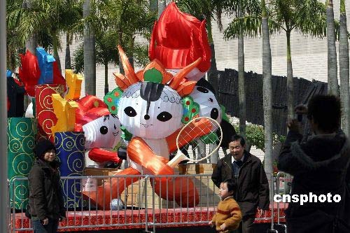 元宵佳節來臨之際,香港康文署斥資三百三十萬元,舉辦多個元宵彩燈會及展覽。在香港文化中心以奧運吉祥物“福娃” 為主題的花燈,吸引眾多游客觀賞。中新社發 洪少葵 攝