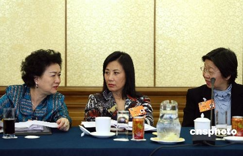 三月四日,全國政協十一屆一次會議進行小組討論常委會工作報告和提案工作情況報告,來自香港的委員朱蓮芬(左)、汪明荃(中)與王敏賢,在香港委員小組討論會上交流。朱蓮芬為香港東匯證券有限公司董事長、香港作家協會會長。汪明荃是香港電視廣播有限公司藝員。王敏賢任香港大學放射同位素研究所所長。中新社發 盛佳鵬 攝