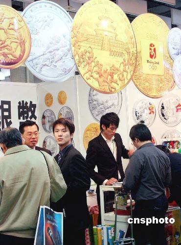 3月7日,為期5天的第21屆亞洲國際郵展在臺北開幕,展出競賽類、非競賽類及榮譽(yù)類的展品超過1000框。其中上海版飛雁加印小字郵票,紅印花加字郵票和大龍試印票等價值新臺幣上千萬元以上的珍稀郵票,最引人注目。圖為一家臺灣公司設(shè)攤展出北京奧運(yùn)紀(jì)念金銀幣,并在現(xiàn)場向民眾贈送北京奧運(yùn)吉祥物福娃宣傳海報。中新社發(fā) 黃少華 攝
