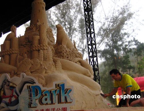 香港海洋公園將于三月二十一日至四月二十日推出“高清動(dòng)物月”,并將舉辦香港首個(gè)大型沙雕展覽,吉尼斯最高及最長沙雕藝術(shù)品的紀(jì)錄保持者Ted Siebert及其隊(duì)友將以二百噸沙進(jìn)行創(chuàng)作。圖為十八日,一位藝術(shù)家正在進(jìn)行沙雕創(chuàng)作。中新社發(fā) 陳伊敏 攝