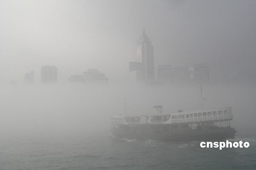 四月六日,香港清晨部分海域能見度低于兩海里,蒲臺島海域今早約六時發生兩艘貨船相撞意外,其中一艘貨船船尾被撞穿入水,事件中無人受傷。國泰航空早上一班由臺北來港的航機轉飛廣州,傍晚才起飛來港。另有一些離島至港島的渡船停開。圖為上午維港掩映在飄渺的白霧中。 中新社發 陳京松 攝