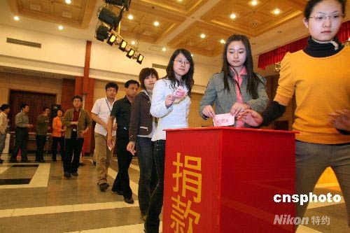 5月13日,國務院僑辦暨直屬單位在北京舉行為四川地震災區捐款活動。5月12日下午,四川省汶川縣發生7.8級大地震,四川部分地區受災嚴重,這場災難牽動著全中國人民的心。中新社發 張勤 攝