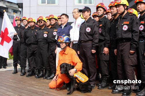 五月十六日上午,臺北市長郝龍斌在臺北市災害應變中心向救援隊授旗,加油打氣。由臺灣紅十字會組織派遣的救援隊一行二十二人和一只搜救犬五月十六日下午將乘包機直飛四川救災。臺灣紅十字會組織派遣的這支救援隊隸屬于臺北市。中新社發 陳立宇 攝