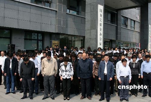 5月19日,國務院僑務辦公室全體機關干部為四川汶川大地震罹難同胞默哀。2008年5月19日至21日為全國哀悼日。中新社發 張勤 攝