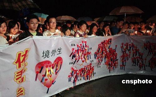 5月19日中國全國哀悼日,福建華僑大學學子點起蠟燭,齊唱《讓世界充滿愛》為四川地震受難者祈禱。圖為在校境外學生手拉條幅,為逝者哀悼、為生者加油。中新社發 傅丹丹 攝