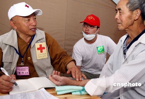 5月21日上午,臺灣紅十字醫(yī)療隊(duì)在四川省廣漢市高坪鎮(zhèn)災(zāi)民安置中心安營扎寨開展醫(yī)療救治。醫(yī)療隊(duì)的中醫(yī)師陳友鳳先生(左),為一名什邡市龍居村65歲的老漢把脈診病。由于當(dāng)?shù)剞r(nóng)民地方口音極重,一名會說普通話的四川大學(xué)生志愿居中擔(dān)任翻譯。