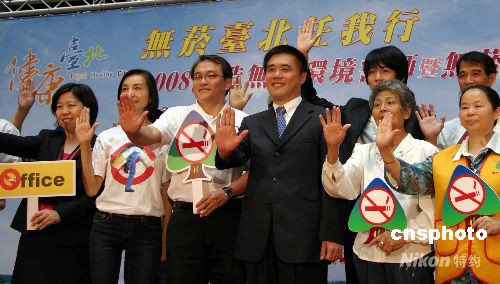 六月二日,近四百位臺北各界禁煙志工匯聚臺北市政大樓,舉行“二00八無煙臺北任我行——營造無煙環境誓師大會”。臺北市長郝龍斌(前右三)吁請市民遵守即將于2009年生效的“煙害防制法新法”。六月三日是臺灣一年一度的禁煙節。將于二00九年一月十一日起施行的“煙害防制法新法”規定:于禁煙場所吸煙者,最高罰款將自現行的三千元新臺幣提高為一萬元新臺幣。中新社發 許曉青 攝