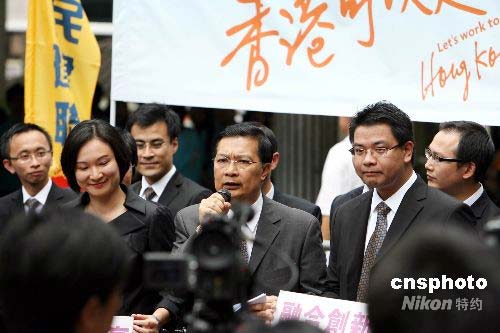 七月十七日,香港民建聯(lián)在遮打花園造勢,向傳媒介紹二十九位參加九月的立法會地區(qū)直選的參選人。香港民建聯(lián)主席譚耀宗表示,希望在九月的立法會選舉中,能保持十二個席位的數目。中新社發(fā) 洪少葵 攝