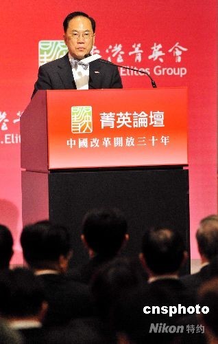 七月三十日,行政長官曾蔭權曾蔭權在香港舉行“菁英論壇”上致辭時表示,香港在國家未來發展中將繼續扮演重要角色,其中在國家深化金融改革方面,可以促進及提升內地的融資效率。中新社發 譚達明 攝