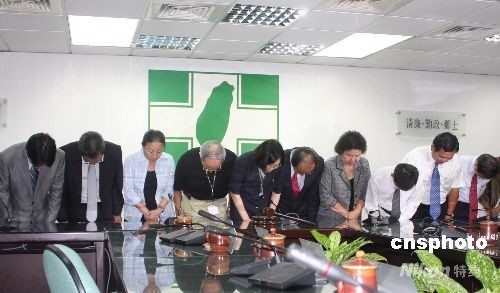 迫于島內公眾壓力,臺灣地區卸任領導人陳水扁十五日下午發表書面聲明表示其夫婦退出民進黨,民進黨傍晚召開臨時中常會,會后黨主席蔡英文宣讀聲明稿,表示接受陳水扁夫婦退黨,并帶領所有中常委透過媒體向公眾鞠躬道歉。中新社發 曾嘉 攝