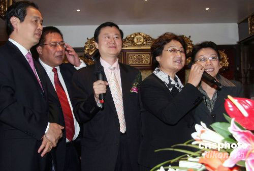 法國僑界十六日晚在巴黎舉行盛大歡迎會,歡迎中國國務院僑辦主任李海峰率團訪法。在僑胞要求下,李海峰(右二)演唱歌曲《常回家看看》,歡迎僑胞;刈鎳、常回家鄉走走看看。中新社發 吳衛中 攝