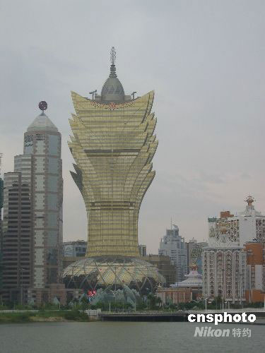 受臺風“黑格比”影響,澳門二十三日十三時改掛三號風球。圖為陰云籠罩下的澳門中銀大廈和新葡京酒店。中新社發 畢永光 攝