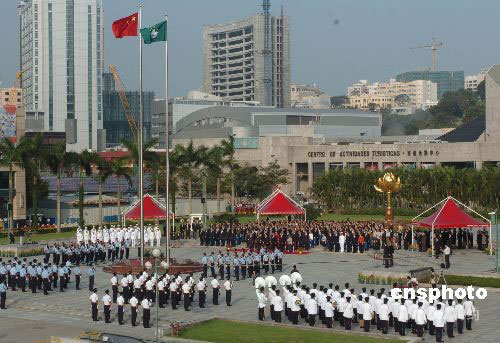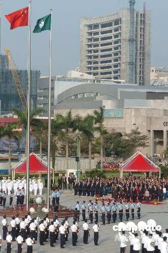 十月一日上午八時(shí),澳門各界在金蓮花廣場舉行隆重升國旗、區(qū)旗儀式,慶祝中華人民共和國成立五十九周年。中新社發(fā) 畢永光 攝