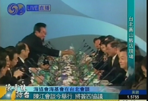 大陸海協會會長陳云林與臺灣海基會董事長江丙坤4日上午九時許在臺北圓山飯店舉行第二次“陳江會談”。這是兩會領導人首次在臺灣舉行會談。江丙坤與陳云林在會上先后致詞后,還互為對方倒水,氣氛溫馨。