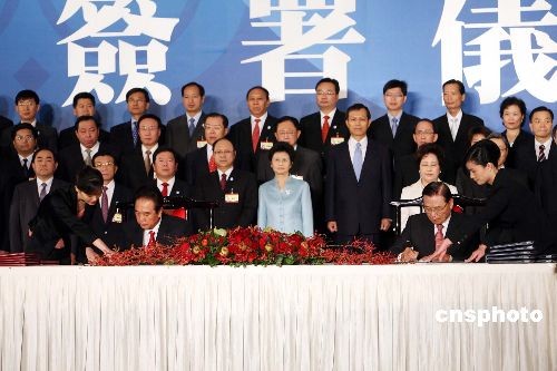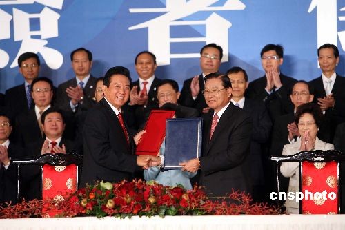 十一月四日,海協會與;鶗谂_北圓山飯店舉行歷史性的會談后,大陸海協會會長陳云林與臺灣;鶗麻L江丙坤下午十四時許在臺北就兩岸海運、空運、郵政、食品安全等議題簽署四項協議。中新社發 洪少葵 攝