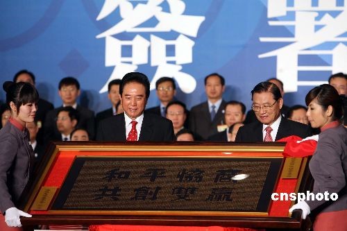十一月四日,海協(xié)會與海基會在臺北圓山飯店舉行歷史性的會談后,兩會領(lǐng)導(dǎo)人陳云林與江丙坤下午兩點舉行兩會簽署協(xié)議儀式,簽署包括空運、海運直航、通郵,以及食品安全等四項協(xié)議。圖為簽署儀式后江丙坤贈與陳云林寫有“和平協(xié)商,共創(chuàng)雙贏”的匾額。中新社發(fā) 洪少葵 攝