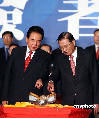 十一月四日,海協會與海基會在臺北圓山飯店舉行歷史性的會談后,兩會領導人陳云林與江丙坤下午兩點舉行兩會簽署協議儀式,簽署包括空運、海運直航、通郵,以及食品安全等四項協議。圖為簽署協議后陳云林贈送江丙坤一尊握手形象的雕塑。中新社發 洪少葵 攝
