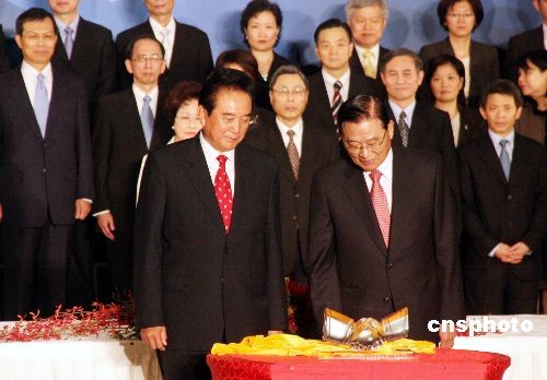 11月4日下午,海協(xié)會(huì)會(huì)長(zhǎng)陳云林和海基會(huì)董事長(zhǎng)江丙坤簽署有關(guān)兩岸空運(yùn)直航、海運(yùn)直航、郵政、食品安全的4項(xiàng)協(xié)議。圖為協(xié)議文本簽署后,陳云林向江丙坤致贈(zèng)水晶作品《握手》。中新社發(fā) 黃少華 攝