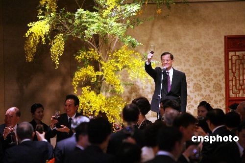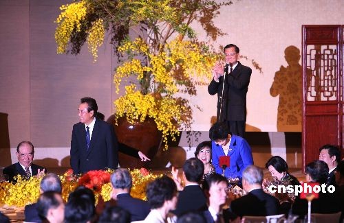 十一月四日晚,國民黨榮譽主席連戰、連方瑀伉儷在臺北國賓飯店設宴款待陳云林訪問團一行。中新社發 洪少葵 攝