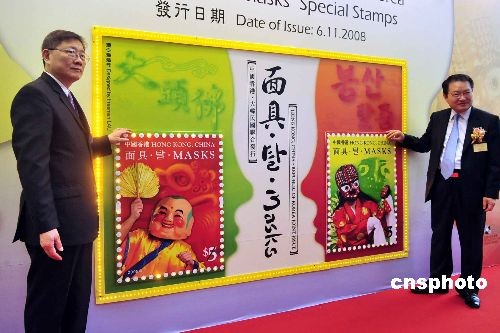 十一月六日,香港郵政舉行“中國香港--大韓民國聯合發行:‘面具’特別郵票儀式,由署理香港郵政署長陳猷烽及大韓民國駐香港總領事石東演(右)主禮。這一套兩枚面值港幣五元的郵票,分別印有中國香港的南獅大頭佛面具和大韓民國的鳳山假面舞面具。中新社發 譚達明 攝