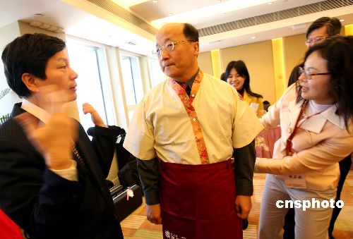 一月八日,臺(tái)灣中部四縣市在香港世貿(mào)中心舉辦“中臺(tái)灣迷你旅展及特產(chǎn)展”活動(dòng)。圖為臺(tái)中市長胡志強(qiáng)穿上民族服飾,向媒體宣傳臺(tái)灣中部的特色景觀。中新社發(fā) 洪少葵 攝