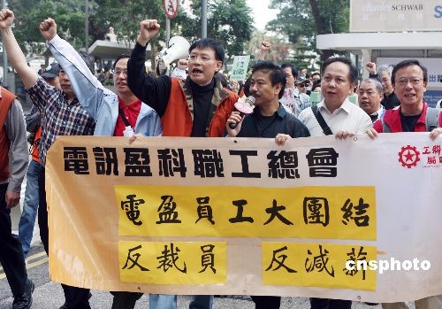 二月二十二日,約三百名電訊盈科員工在香港游行,抗議電盈在有盈利的情況下裁員,沒有盡社會責任。中新社發 武仲林 攝