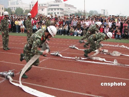 “119”消防安全宣傳日臨近,11月7日,山東棗莊公安消防支隊(duì)官兵到駐地棗莊學(xué)院,現(xiàn)場(chǎng)示范表演消防水帶連接、破拆搶險(xiǎn)救援、百米翻越障礙、高空遇險(xiǎn)救援等消防技能。中新社發(fā) 季龍 攝