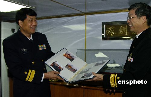 圖為河村正雄少將(右)向中國軍艦出訪指揮員、南海艦隊副司令員肖新年少將贈送記錄下雙方友好交流眾多珍貴瞬間的紀念影集。