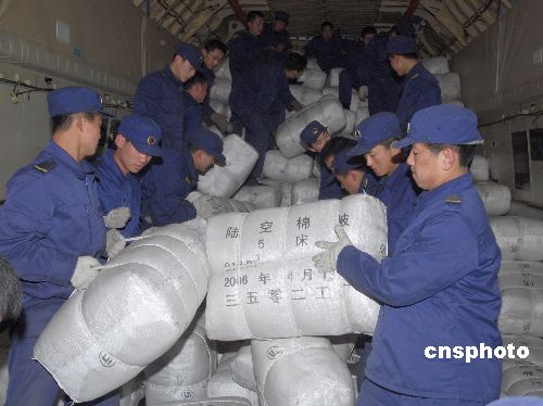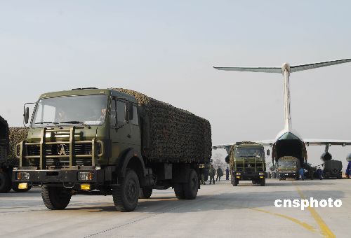 2月1日下午,中國空軍運輸機再次抵達山西長治某軍用機場,緊急空運救災物資到南方冰雪災區。從1月31日起,中國空軍運輸機多次飛抵該機場,駐當地某部先后出動官兵400多人次,動用車輛裝備130多臺次,日夜奮戰,已經將100多噸棉被棉衣等救援物資分6個架次空運南方,以解南方災區人民御寒之急。中新社發 姚林 攝