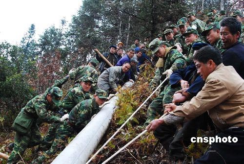 圖:中國(guó)廣西駐軍幫助冰凍災(zāi)區(qū)搶修電力設(shè)備
