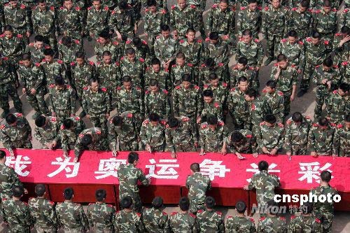 4月30日,在慶祝北京奧運會倒計時100天活動中,擔負北京奧運會秦皇島賽區執勤任務的武警河北總隊,組織官兵們在“我為奧運添光彩,我為祖國做貢獻”的標語上進行簽名活動,以此來表達他們在即將走向執勤崗位之際所發出的錚錚誓言。中新社發 余洪恩 攝