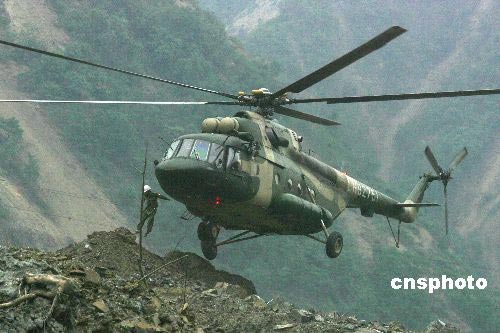五月二十日是汶川大地震第九天,成都軍區陸航團姜廣偉王牌直升機組上午十時成功以單輪強降北川重災區“定時炸彈”——堰塞湖無名塌方小土堆上,緊急運送水利地質技術隊實地監測水位上漲危情。一座大山的崩塌堵塞河道形成危險的堰塞湖,如果潰堤將危及北川全縣和綿陽災區。中新社發 賈國榮 攝