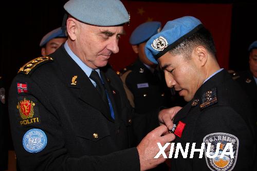 11月16日,中國第五批駐科索沃維和警察榮獲聯合國維和勛章的授勛儀式在科首府普里什蒂納舉行。第五批中國維和警察于2008年3月11日抵達普里什蒂納,執行聯合國為期一年的維和任務。這支警隊是四川省公安廳受中國公安部委托單獨組建的。新華社記者連國輝攝
