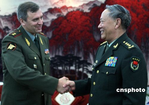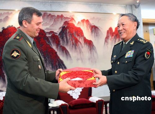 中央軍委委員、中國人民解放軍總參謀長陳炳德上將,10月24日下午在北京八一大樓會見來訪的俄羅斯武裝力量第一副總參謀長布魯京中將,雙方在友好的氣氛中進行了交談。中新社發 宋吉河 攝